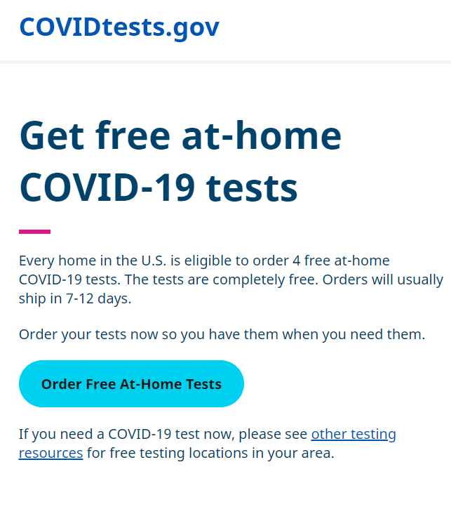 Each American household is entitled to free rapid COVID-19 tests, which can be ordered online at COVIDtests.gov. At the outset of the program, each household will be limited to four testing kits, which will be shipped for free to homes via the United States Postal Service. Ordering is as simple as entering your name and address.
