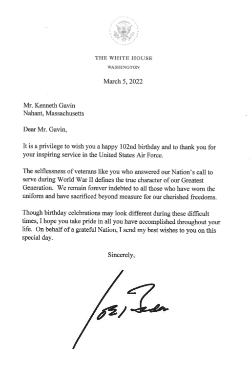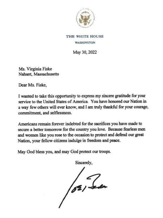 The town of Nahant is proud to recognize Kenneth Gavin (102) and Virginia Fiske (103) for their devoted service in the United States armed forces. They truly embody the values of dedication, strength, bravery, and selflessness and we are honored to call these individuals residents of Nahant. President Biden has recognized them for their unwavering years protecting our country and its people.
