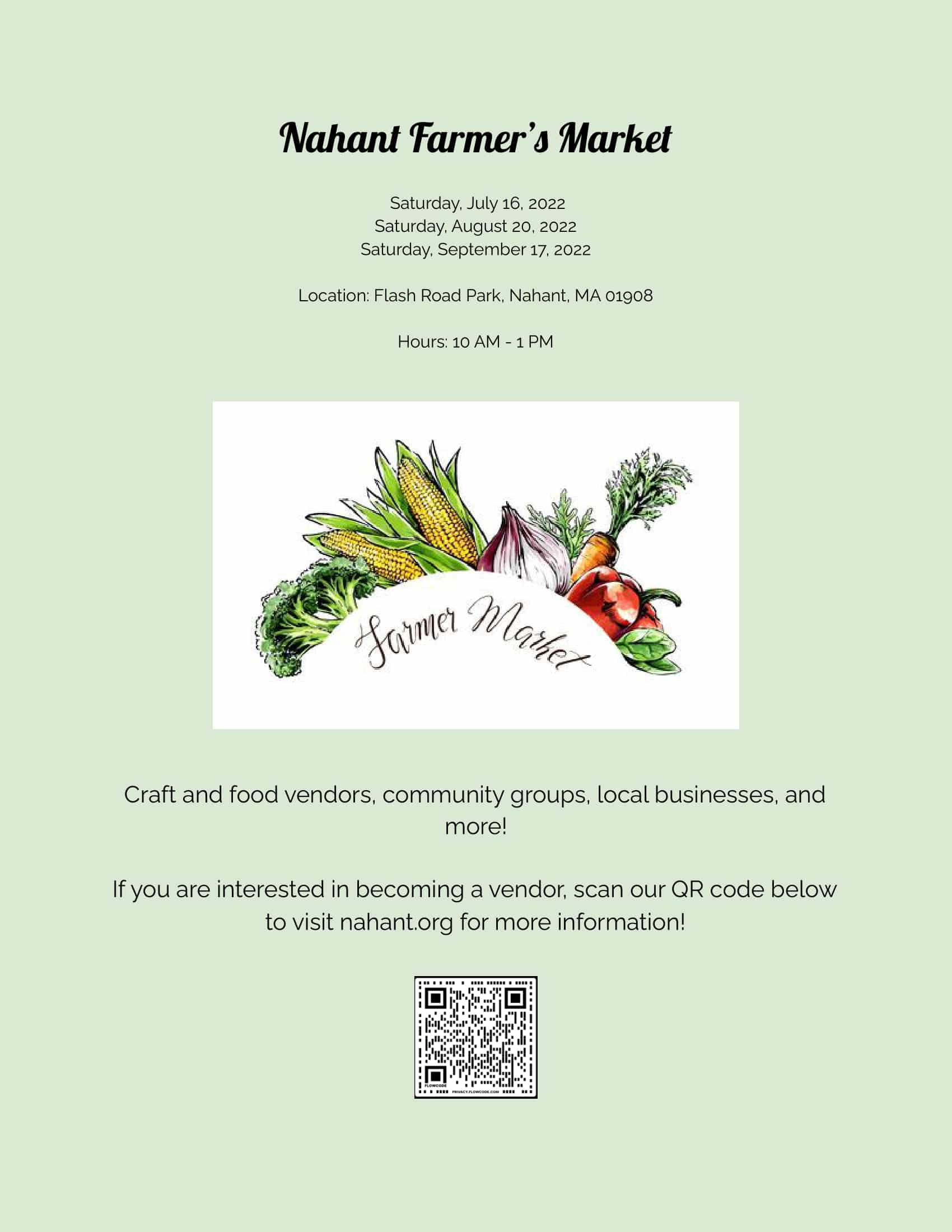 Please visit our Farmers Market Page at nahant.org for more information or email ktaylor@nahant.org