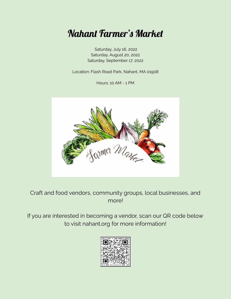 Looking forward to our three upcoming Farmer’s Markets! We welcome craft and food vendors, community groups, local businesses and more. We are still looking for vendors and accepting applications for all three markets. See the flyer below for additional information or visit our Farmer’s Market page on nahant.org.