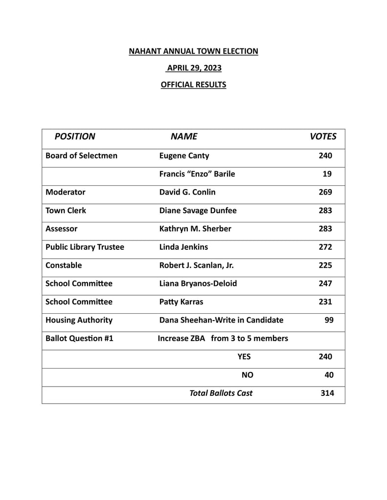 The Annual Town Election was Saturday April 29, 2023 and the Official Results are in. We would like to Thank all of those who ran. We appreciate your continued dedication to the Town and it’s residents.
