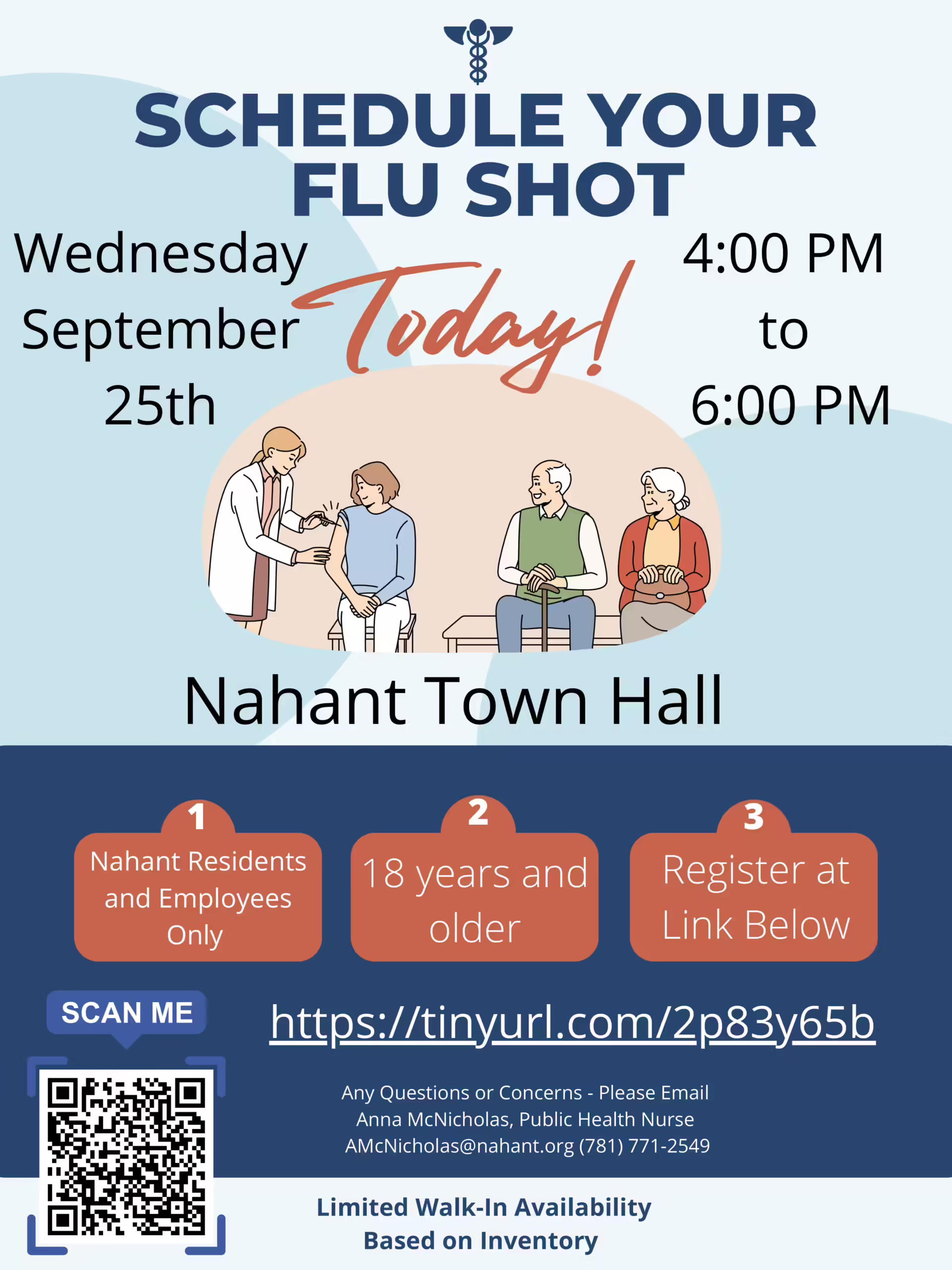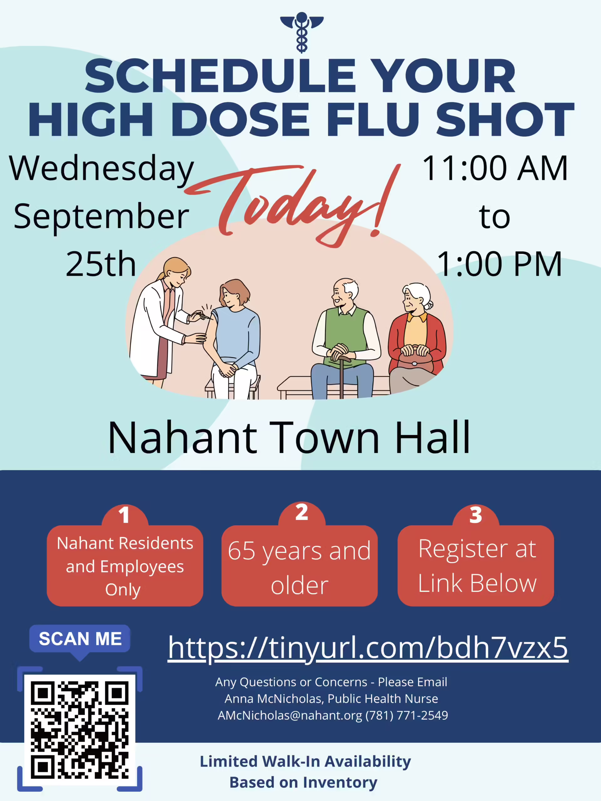 The Nahant Town Hall and Public Health Department will be holding a Flu Shot Clinic for High Dose and Regular Dose Flu Shots.