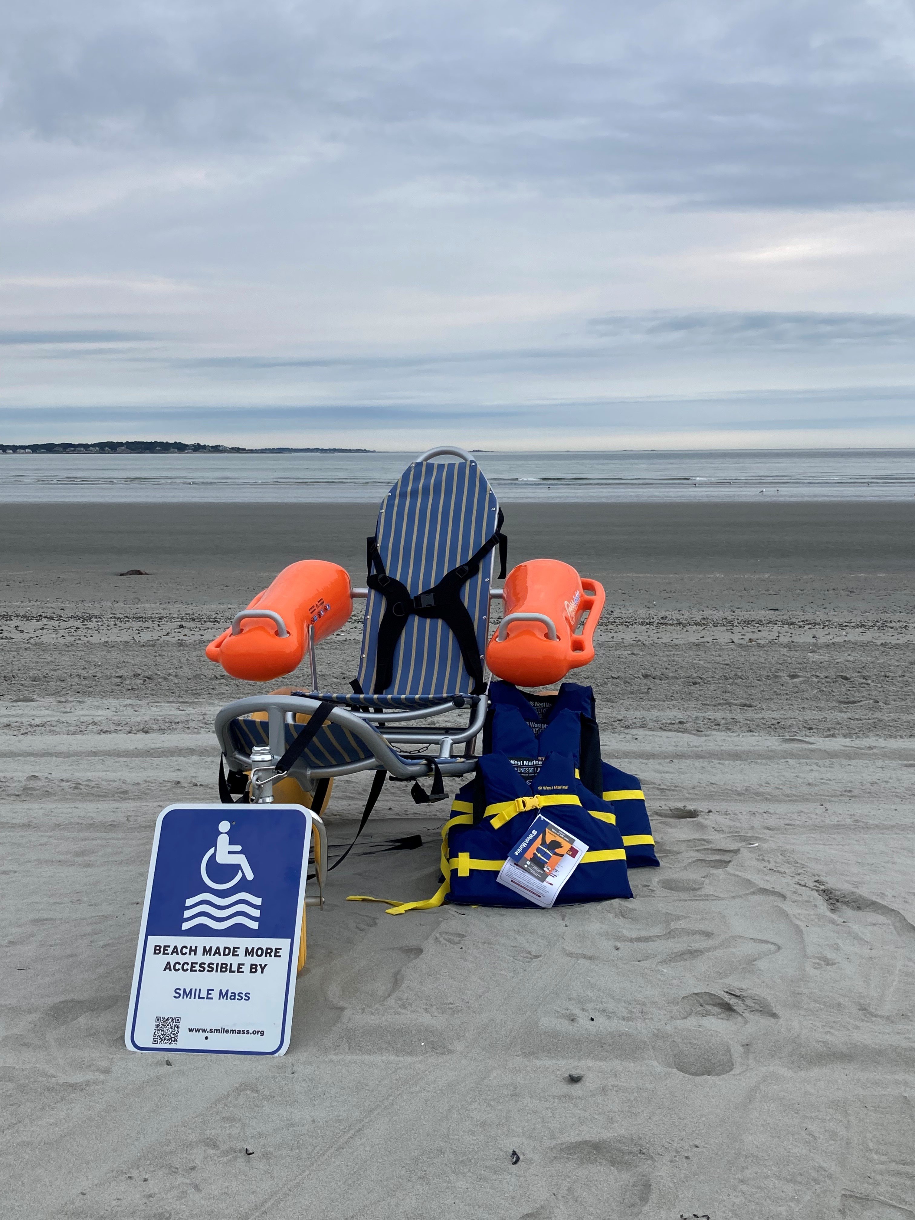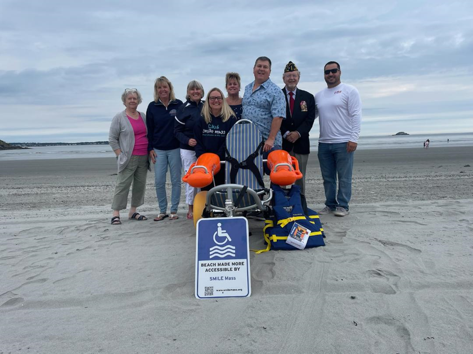 The community thanks the Miles Family for spearheading this project along with Lynda Fields of the Nahant Preservation Trust. Together they have coordinated the placement and volunteer operations to make the beach wheelchair accessible. Additional thanks to Emily Potts of the Nahant Preservation Trust, Town Administrator Tony Barletta, the Board of Selectmen, the American Legion and American Legion and Auxiliary of Post 215, and Fire Chief Austin Antrim for their coordinated effort with SMILE Mass to work out all the issues to quickly make the chair available for people to more easily access Short Beach.