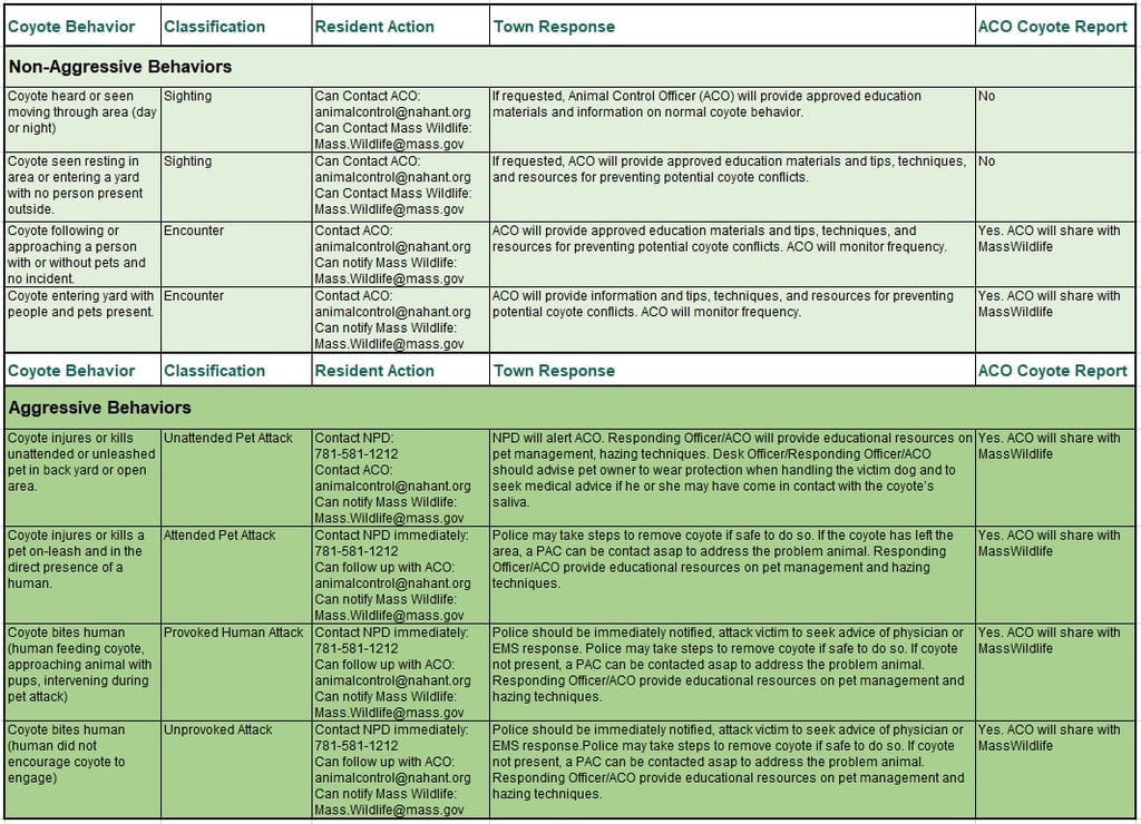 It is important that you report coyote behavior to the Town of Nahant. This will help identify a possible den location and allow the Town to notify residents through the Town website and through signage. This could prevent future conflict during this period. If you feel you or your pet is in immediate danger, call the Nahant Police Department at 781-581-1212. Please follow the matrix below on how to report coyote behavior to the Town based on the type of behavior you observed.