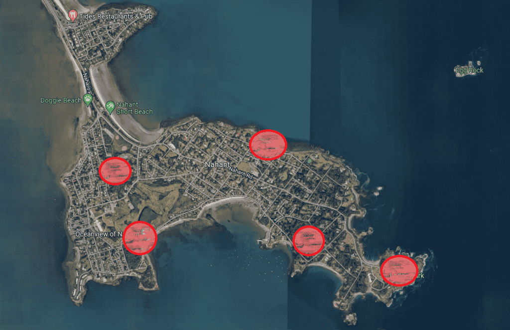 This map of Nahant highlights areas that are possible locations for coyote dens. They are not confirmed den locations. Once a coyote den has been located, residents should avoid that area with dogs during the denning period (April-May) to prevent possible aggressive encounters.