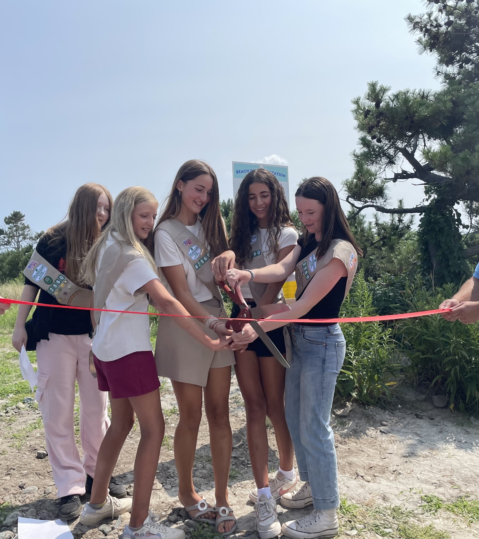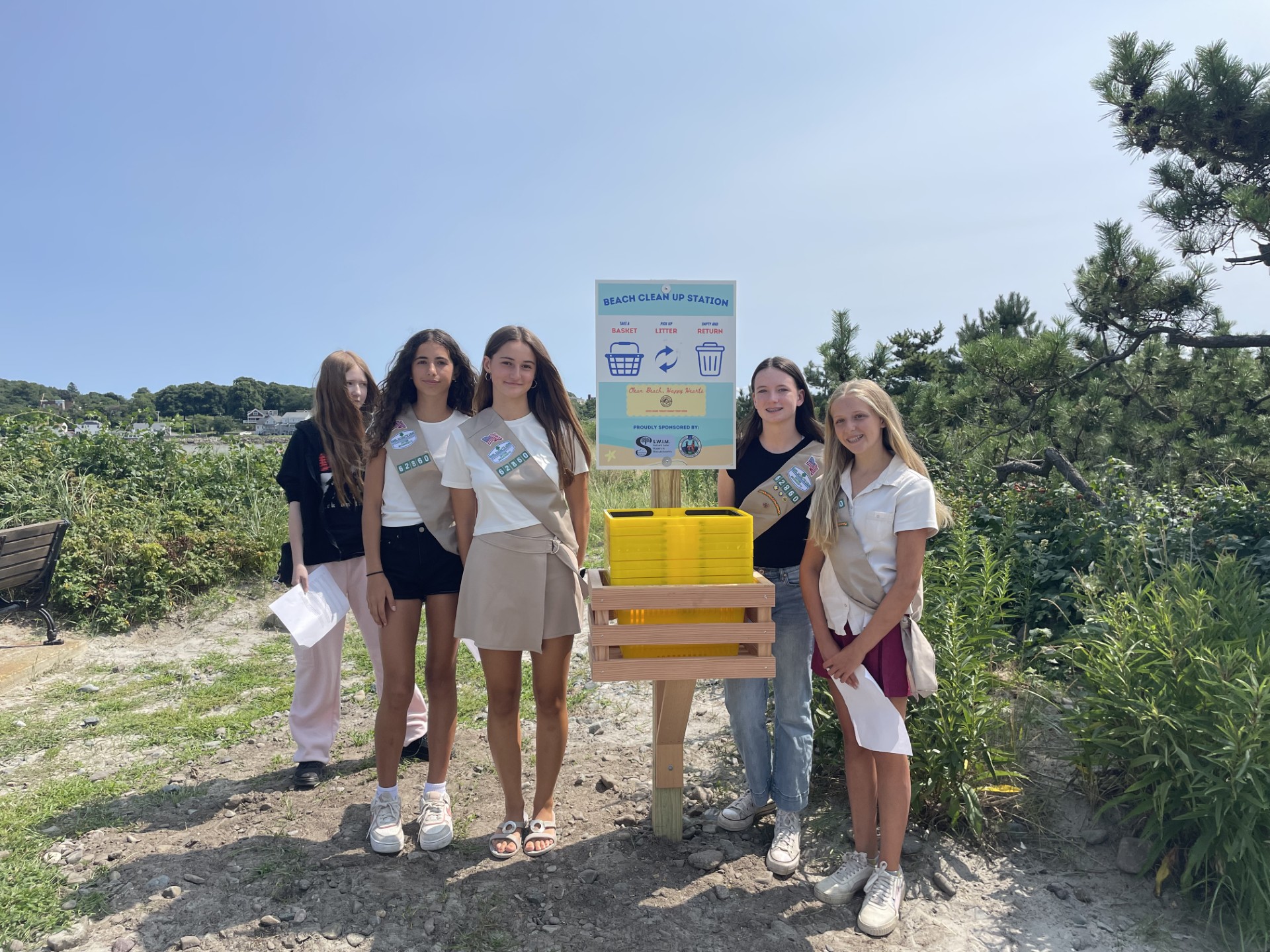 On Tuesday, August 13th, five Nahant Girl Scouts in Troop 62860–Ione Byam Miller, Maeve Nugent, Violet Powell, Julianne Sheehan, and Eliana Uzcategui–celebrated the installation of their Beach Basket Coastal Cleanup Resilience Project alongside Town Administrator Tony Barletta and Select Board Members Rob Tibbo and Gene Canty. The completion of their project comes after months of work, in which, the Girls in Troop 62860 identified a community issue and developed a solution to address it. With help from the Nahant DPW and Safe Waters in Massachusetts (SWIM), the Girls installed four Beach Basket Stations: two at Short Beach and two at Tudor Beach.