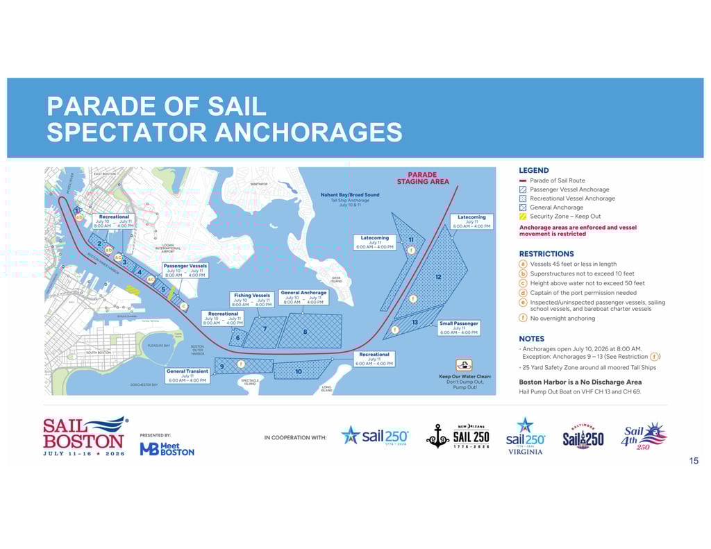 Below you will find two different images showing the anchorage areas and parade route. Click on each image to enlarge