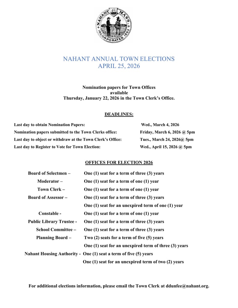 The Election polling hours are on Saturday April 26, 2025 from 7:00 A.M. until 7:00 P.M. in the Main Hall of the Nahant Town Hall. Use of parking in the rear and side of Town Hall is encouraged with handicapped parking in each lot.