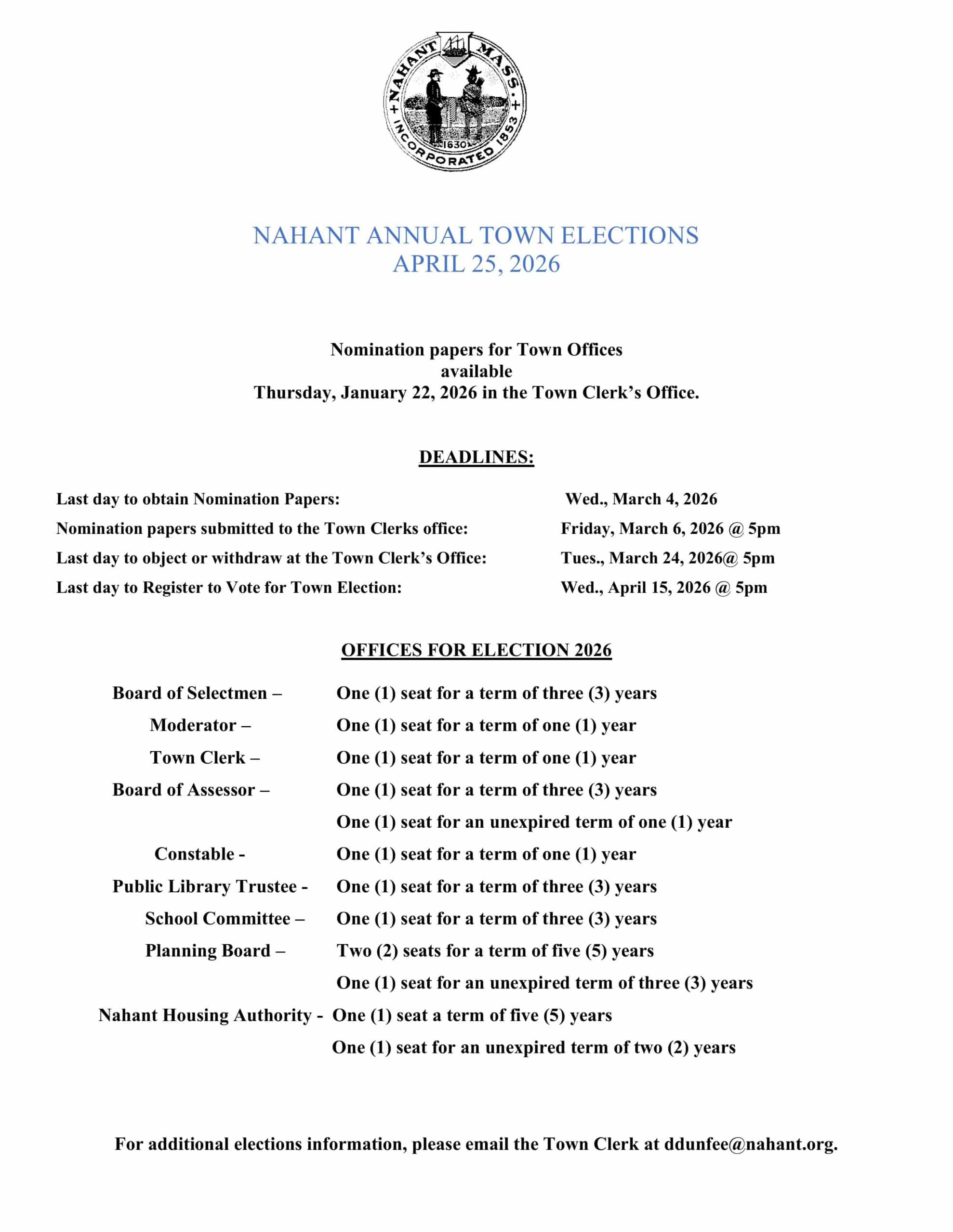 ANNUAL TOWN ELECTION – SATURDAY APRIL 25, 2026